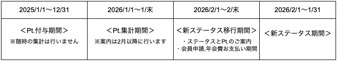 毎年1/1〜1/末に事務局がポイントを集計(集計対象:前年1/1〜12/31付与Pt.を累計)し、毎年2/1〜2/末を新ステータス移行期間とし、翌年以降も同じサイクルとなります。